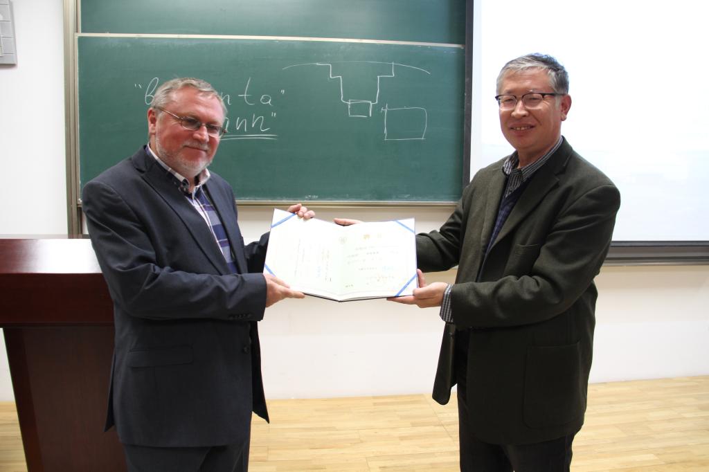 2016年10月14日下午,内蒙古大学在南校区举行聘任仪式,聘请尼古拉.尼古拉维奇.卡拉丁(NikolayNikolaevichKradin)教授为内蒙古大学客座教授,amjs澳金沙门线路首页院长那顺巴依尔教授为尼古拉.尼古拉维奇.卡拉丁(NikolayNikolaevichKradin)教授颁发了证书。