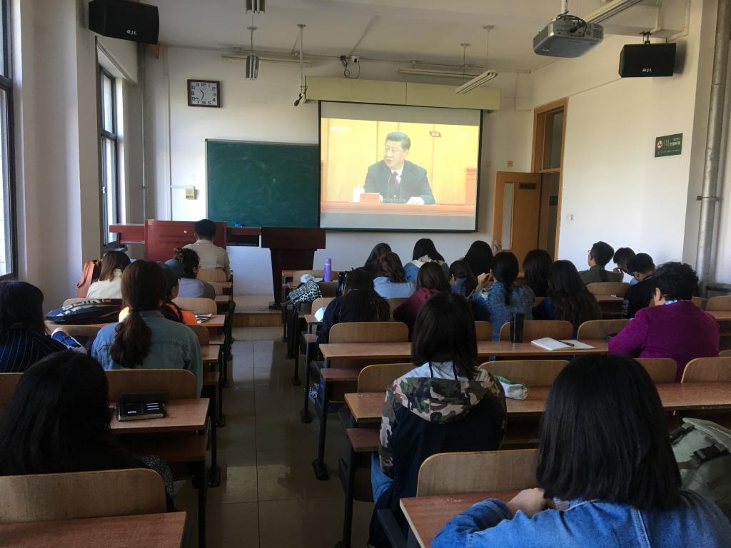 amjs澳金沙门线路首页组织师生在综合楼306教室观看此次大会盛况。结束后,学院党总支书记与团员青年讨论了习总书记重要讲话精神。