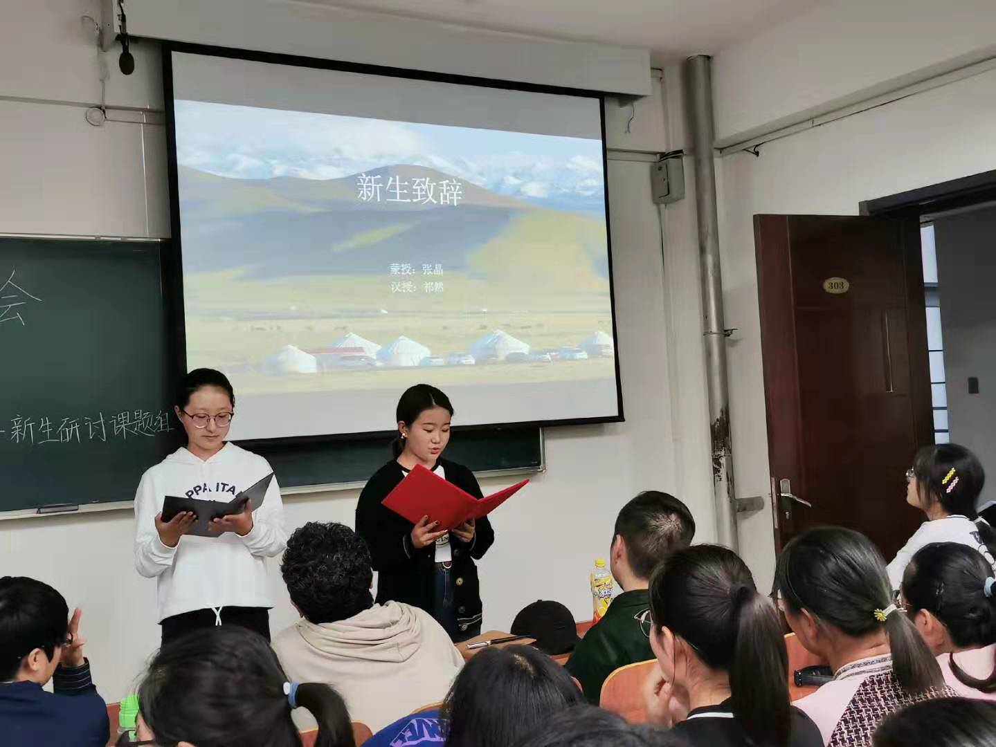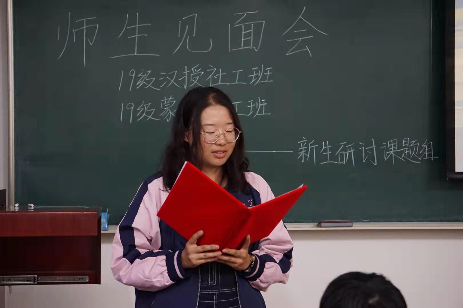 最后,新生们也对老师送上了祝福。两位学生代表祁然同学、张晶同学把教书比作伟业、师泽比作烛光,蒙授班的同学们以一首诗朗诵《苏》歌颂了老师们的辛勤付出;汉授班的同学们以《每当我走过老师窗前》、《国家》两首歌曲祝福祖国和老师。
