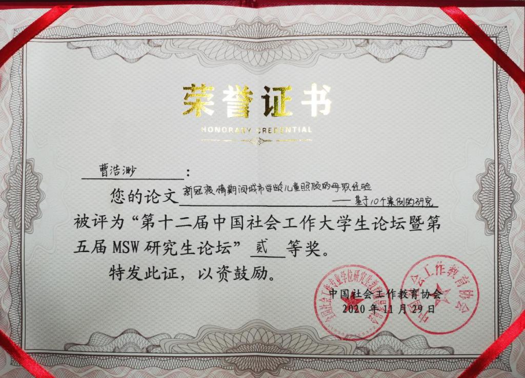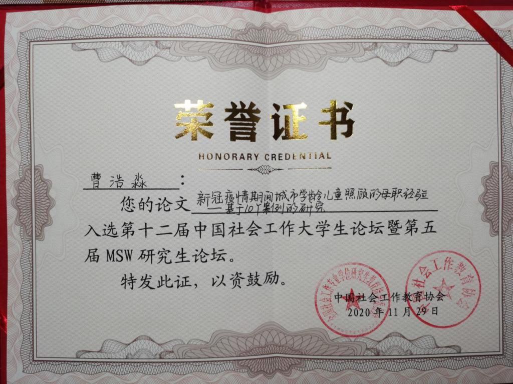 2020年11月29日,第十二届全国社会工作大学生论坛暨第五届研究生论坛顺利落下帷幕。amjs澳金沙门线路首页社会工作专业2019级研究生曹浩淼同学参加并获得了二等奖的好成绩。