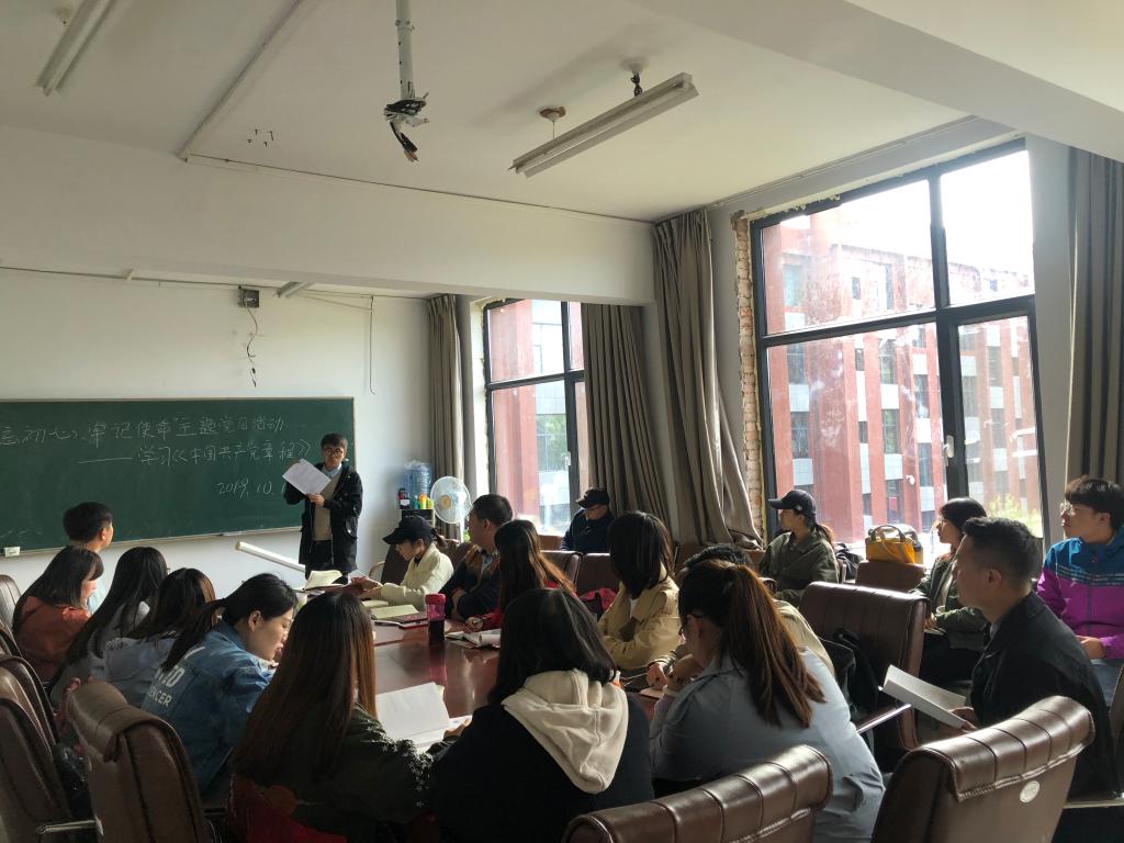会议第二项,开展“不忘初心、牢记使命”主题教育,邀请到学术性研究生党支部书记闫东东老师,讲解《中国共产党章程》。