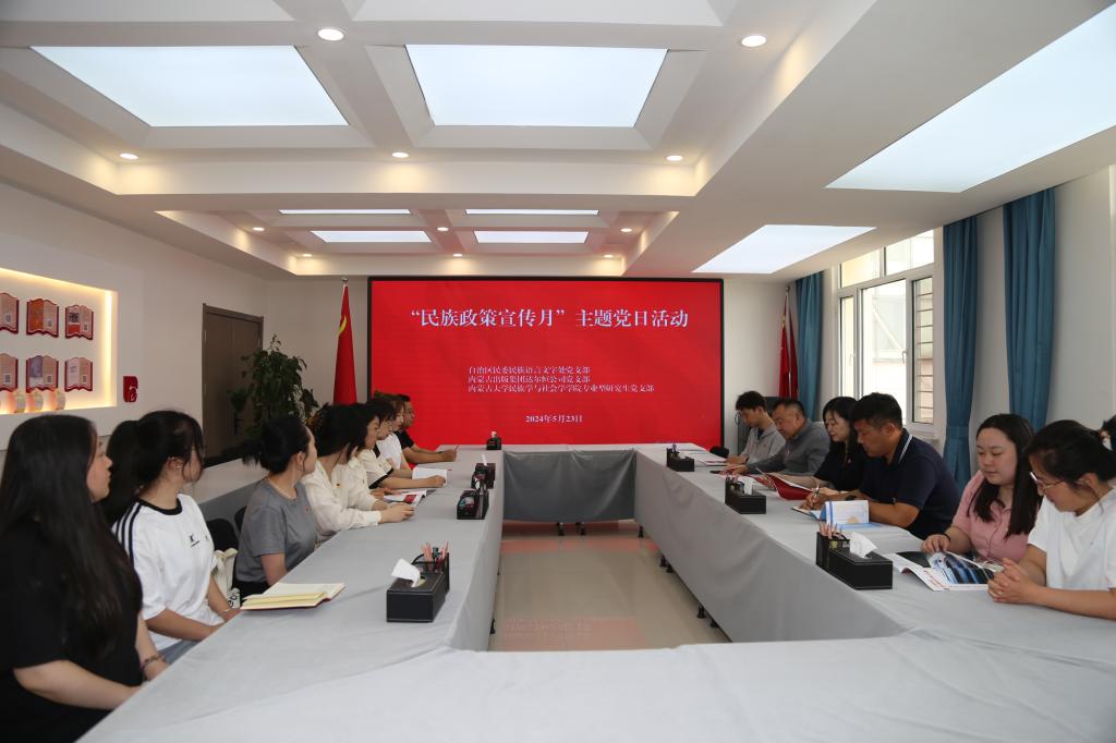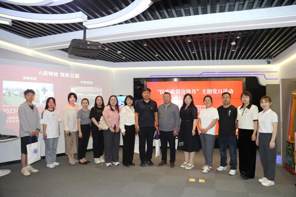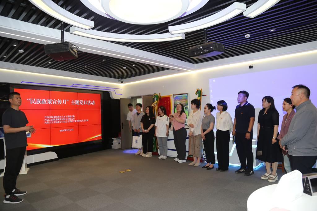为深入学习贯彻习近平新时代中国特色社会主义思想,全面贯彻习近平总书记关于加强和改进民族工作的重要思想 以及对内蒙古的重要指示精神,有形有感有效做好铸牢中华民族共同体意识各项工作,以民族政策宣传月为契机,以“感党恩、听党话、跟党走”群众教育实践活动为抓手,5月23日,amjs澳金沙门线路首页专业型研究生党支部前往内蒙古自治区民委地方语言文字研究应用中心与自治区民委民族语言文字处党支部、内蒙古出版集团达尔恒公司党支部联合开展“铸牢中华民族共同体意识”主题党日活动。